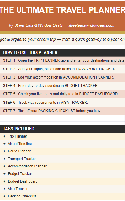 Ultimate travel planner spreadsheet for couples planning long term travel. Excel and Google Sheets compatible trip planner with 10 tabs covering budget tracker, budget dashboard, route planner, transport tracker, accommodation planner, visa tracker and packing checklist. Built by Mark and Bec at Street Eats and Window Seats for midlife travellers planning extended trips of 3 to 12 months.
