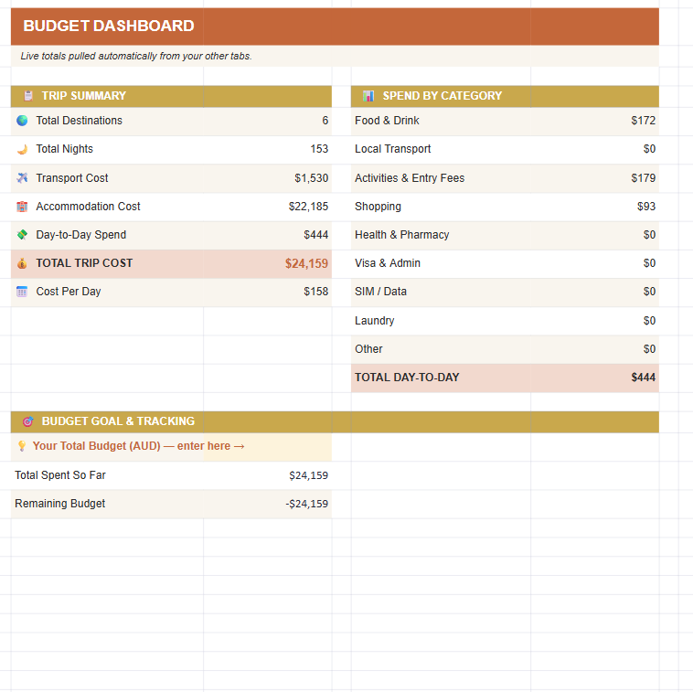 Stop juggling tabs, apps and notebooks. This 10-tab Excel and Google Sheets planner handles your entire trip from the first destination to the final budget tally — built by real travellers who’ve used it on the road.